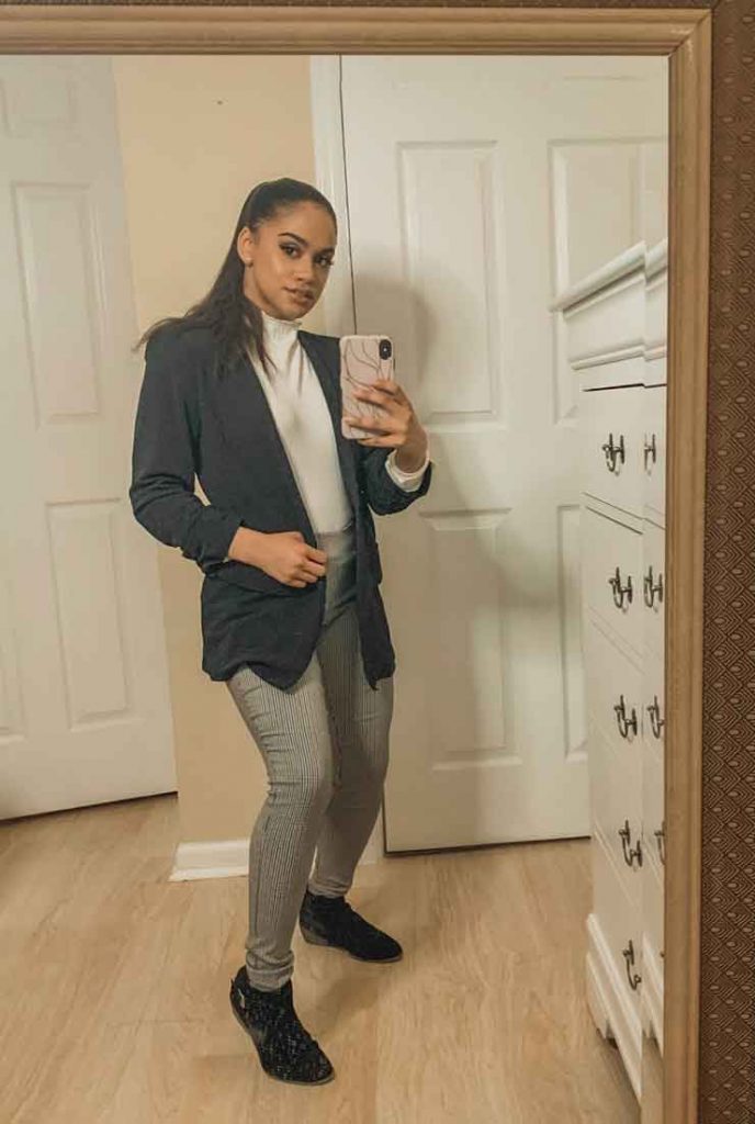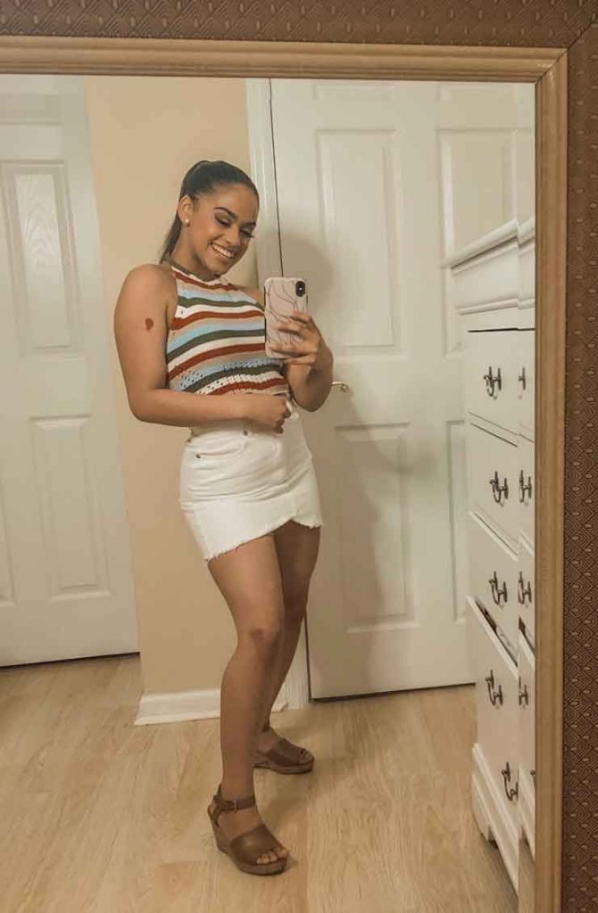 Rosie HW is a beautiful woman who kills it on her Instagram feed. I attempted to pose like her famous mirror picture. It may look simple, but it is quite harder than I expected. I took about 20 pictures before I got the best one. The key to this pose is to place one foot in front of the other and bend your knees a little bit, but not too much so that it does not look awkward. Also, keep in mind to relax your arms to make sure the pose looks natural. I look forward to seeing all of you recreate Rosie HW’s pose!