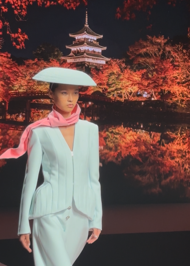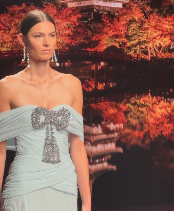If it was a glance in April, the Madrid fashion show in September is a clear look to Asia. While past collections have been set against the backdrop of an olive tree, for example, – the family, including Paco, Isabel’s husband, who was also backstage, has not forgotten where they come from,- this year’s backdrop was a Japanese temple. But that’s not all; the models walked, or should I say floated in all those opulent robes and suits, across an orange bridge that brought me straight back to the similarly colored gates at the Fushimi Inari-Taisha shrine in Kyoto.