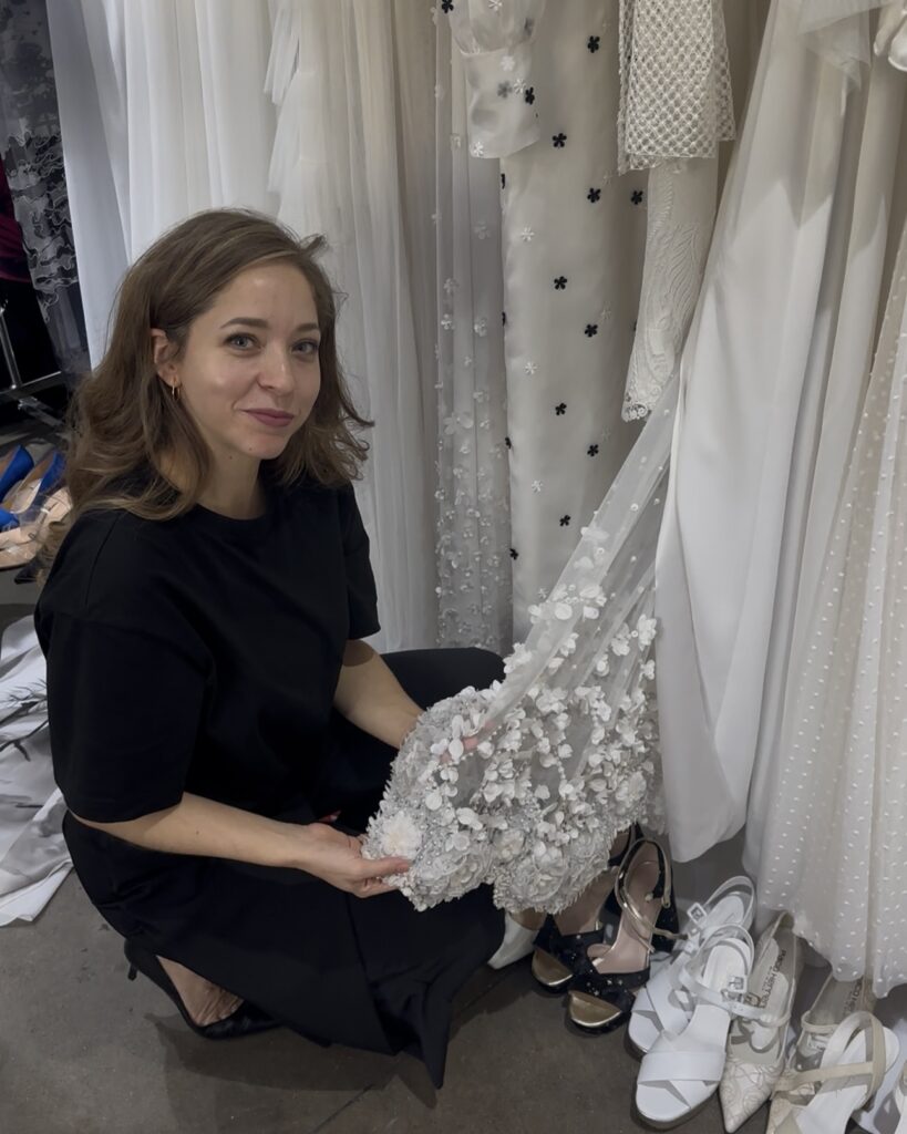 Moments before the shows backstage, I conversed with Laura Lomas of her also eponymous brand. She reached for one of lace tulle embroidered designs. “All of these dots are embroidered by hand,” she said, holding it up to show me. Wow.